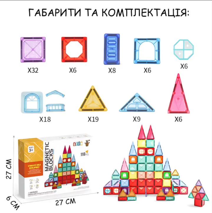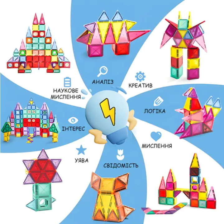 Цей барвистий магнітний набір — ідеальний подарунок для дітей від 3 років. Завдяки простому магнітному з’єднанню блоки легко та надійно скріплюються між собою, даючи змогу створювати 3D-фігури, будівлі та будь-які інші фантастичні конструкції. Безпечний, міцний і надзвичайно захопливий — справжня знахідка для допитливих малюків!